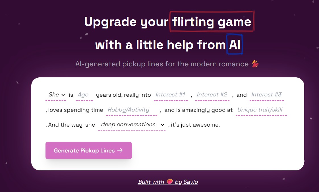 Flirtify генерирует с помощью ИИ фразы для флирта и общения с противоположным полом на основе интересов. Создавайте умные и современные фразы для знакомства.